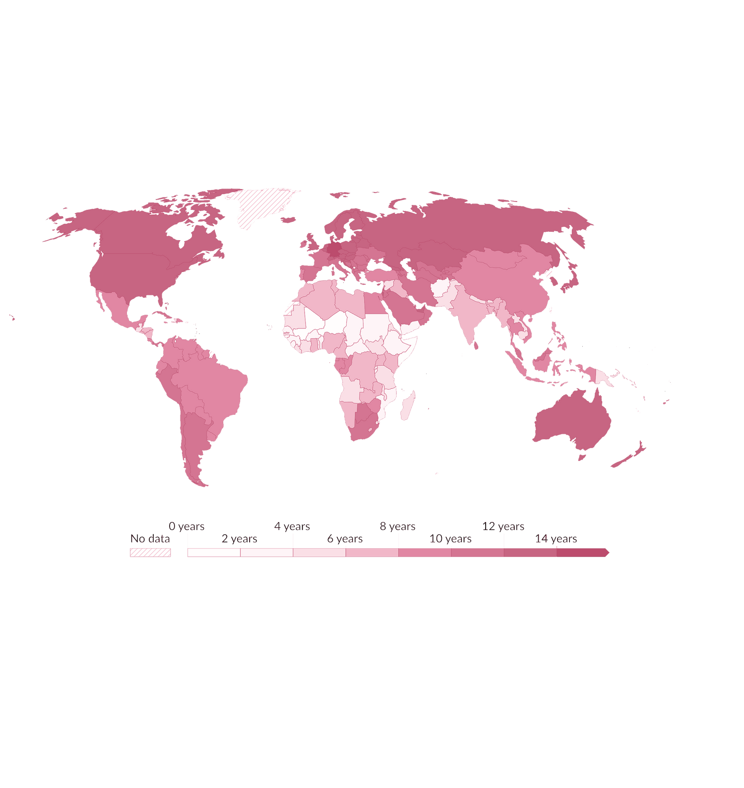 This map illustrates the average number of years adults (25+) have spent in formal education.