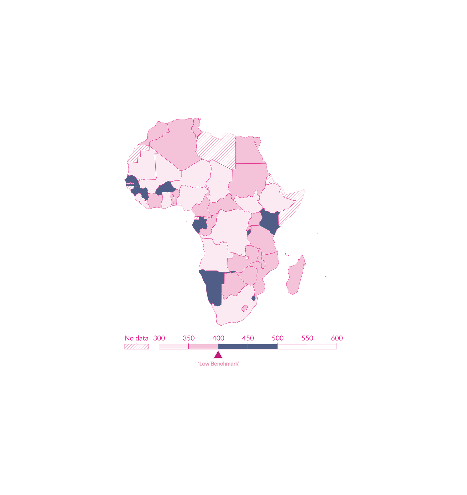 This map displays Trends in International Mathematics and Science Study scores across Africa, measuring student performance in math and science. Many regions fall below the low benchmark, indicating severe gaps in foundational learning. Students in these regions struggle to meet the bare minimum of global education standards.
